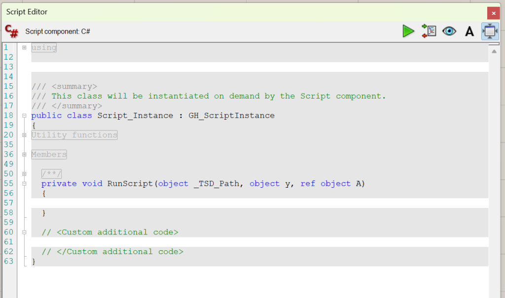 You will also notice that most of the lines in the script editor are grey – these are lines we cannot edit or change. We can define new functions outside RunScript in the ‘Custom Additional Code’ section and we can call those functions from within the RunScript function.